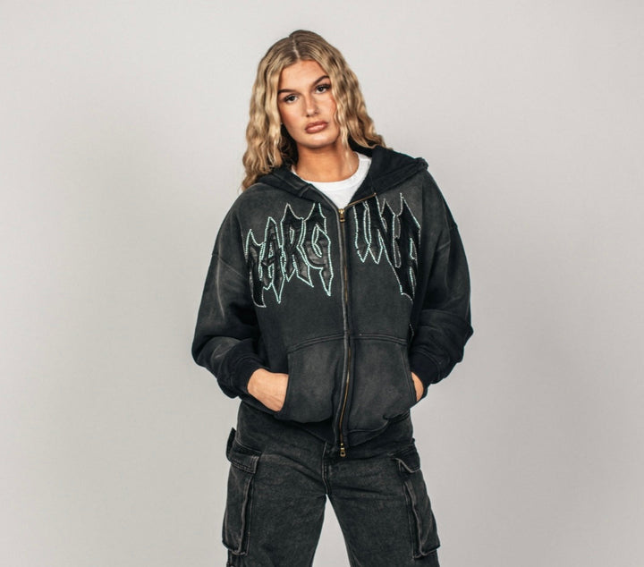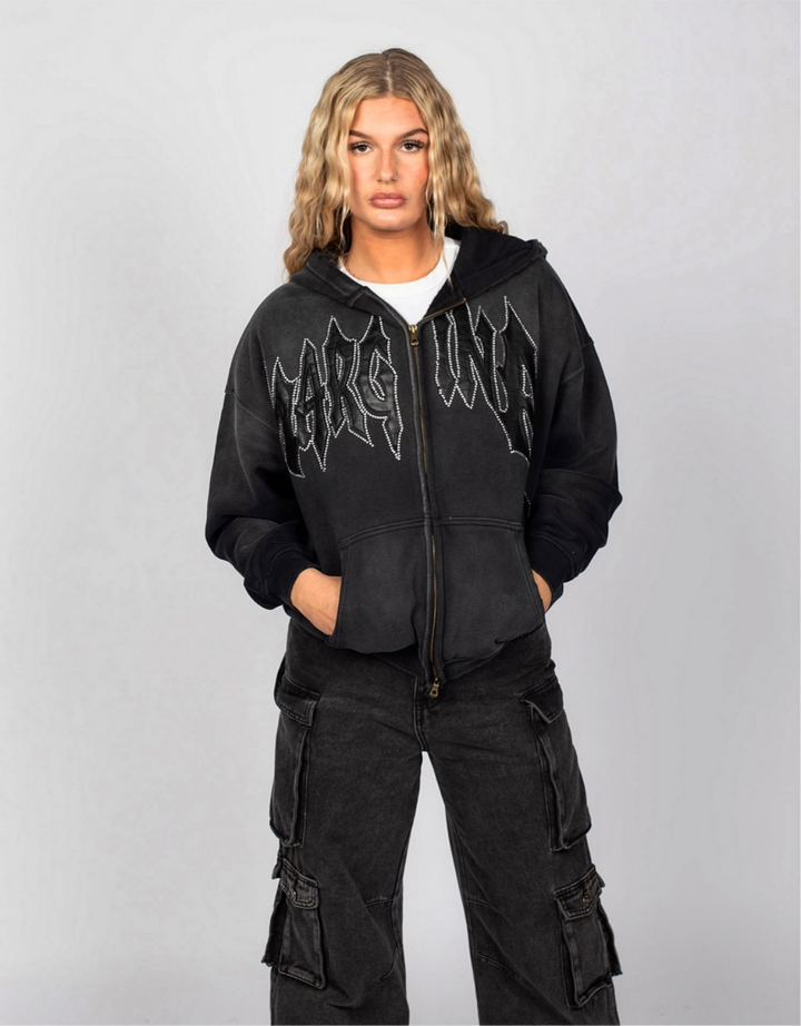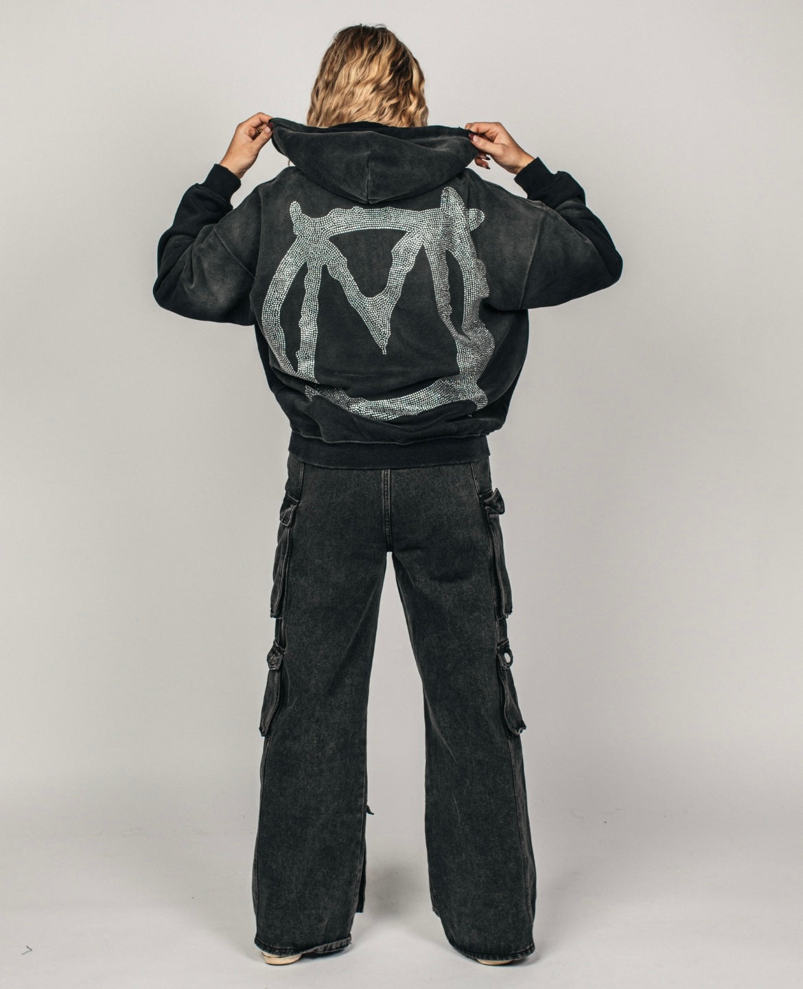 Details: Hand-distressed acid wash with rhinestone accents on the front and back